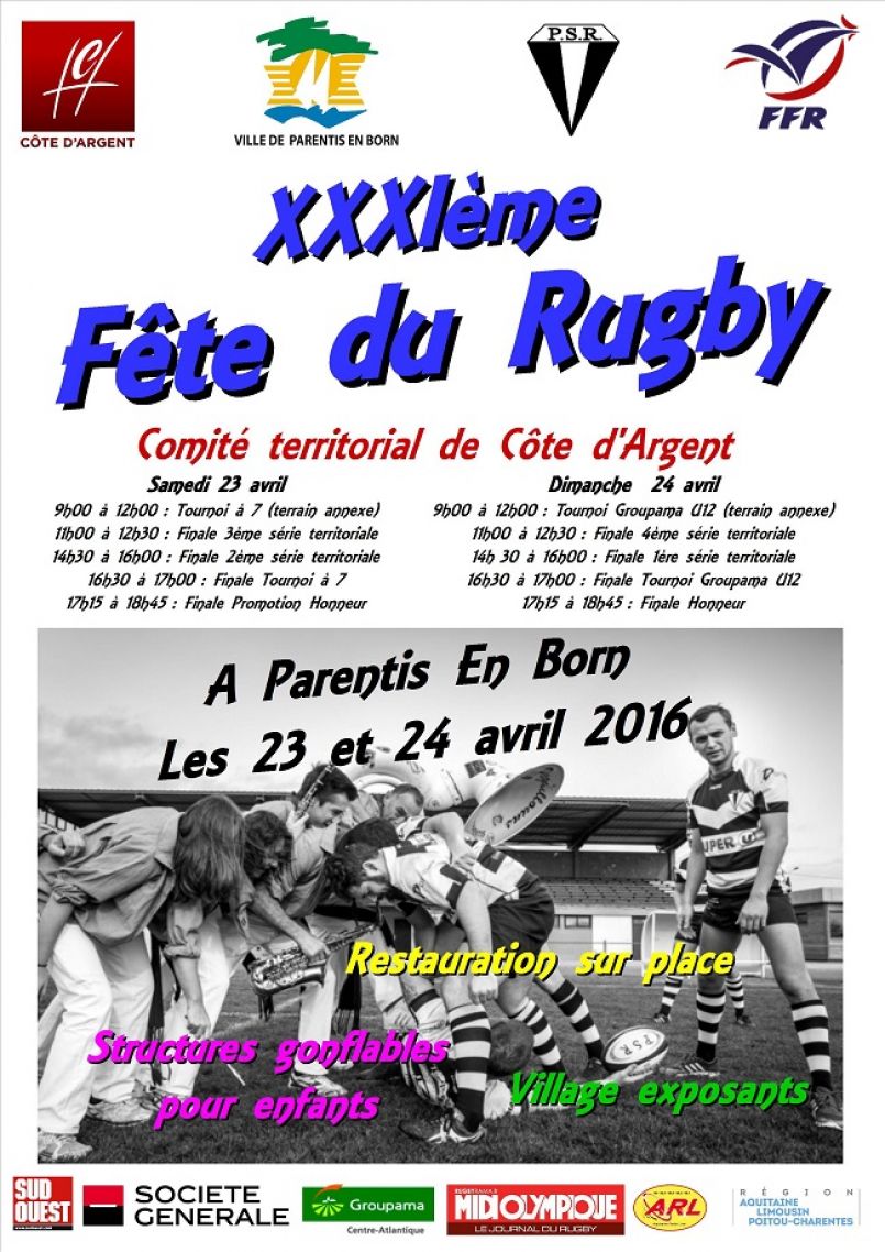 31ème Fête du rugby du Comité territorial de Côte d’Argent ce week-end qui verra à 9h ce samedi se dérouler la finale du Tournoi à 7, à 11h celle de 3ème série et à 14h30 la der de 2ème. Dimanche à 11h finale de 4ème série, de 1ère à 14h30 et d’Honneur à 17h15.