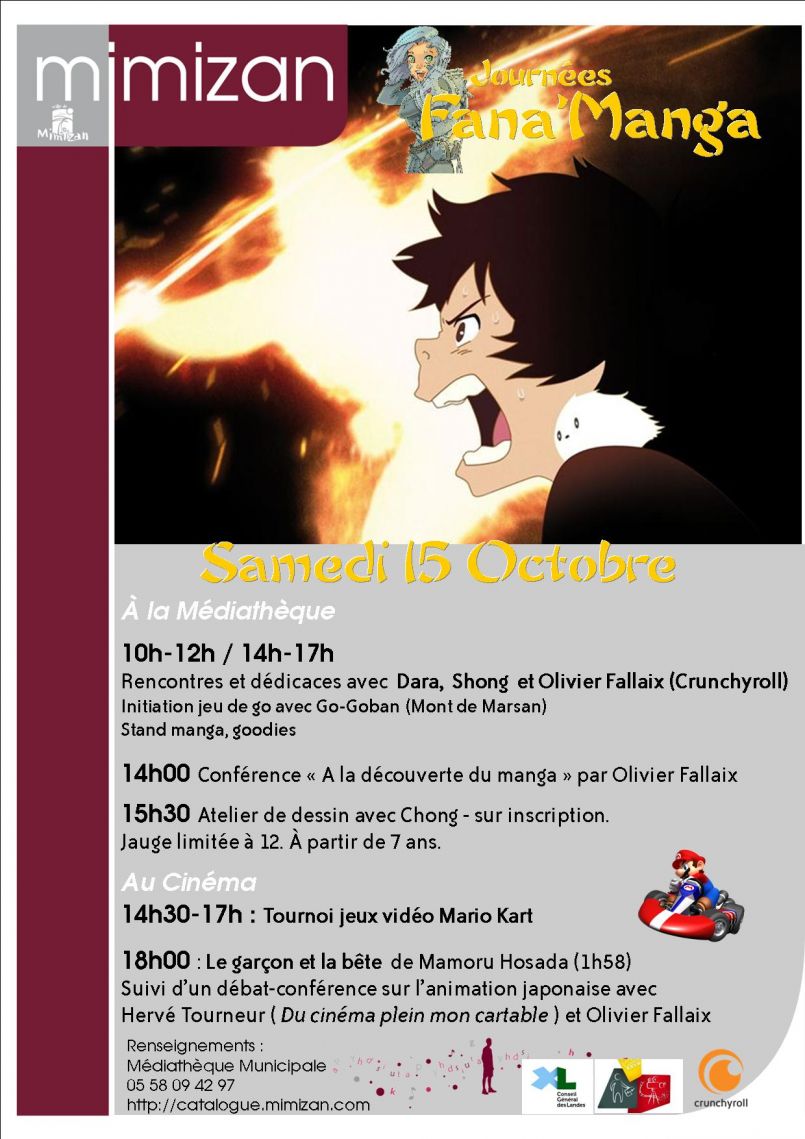 Couleurs ‘Manga’ ce samedi 15 octobre avec de très nombreux temps forts : des projections, conférences, tournoi de jeux et rencontres/dédicaces avec de délicieux dessinateurs et auteurs.